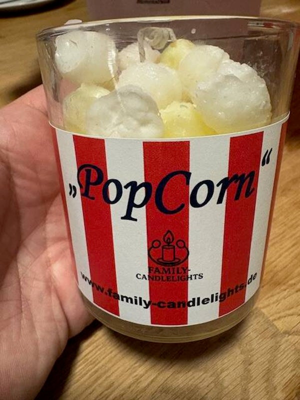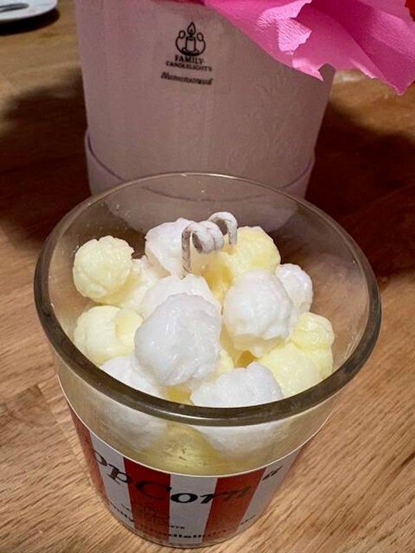 Süßer Popcornduft und ein tolles Design. Das alles haben Sie bei dieser Kerze. Sie besteht aus Soyawachs und ist daher auch super für Allergiker geeignet.