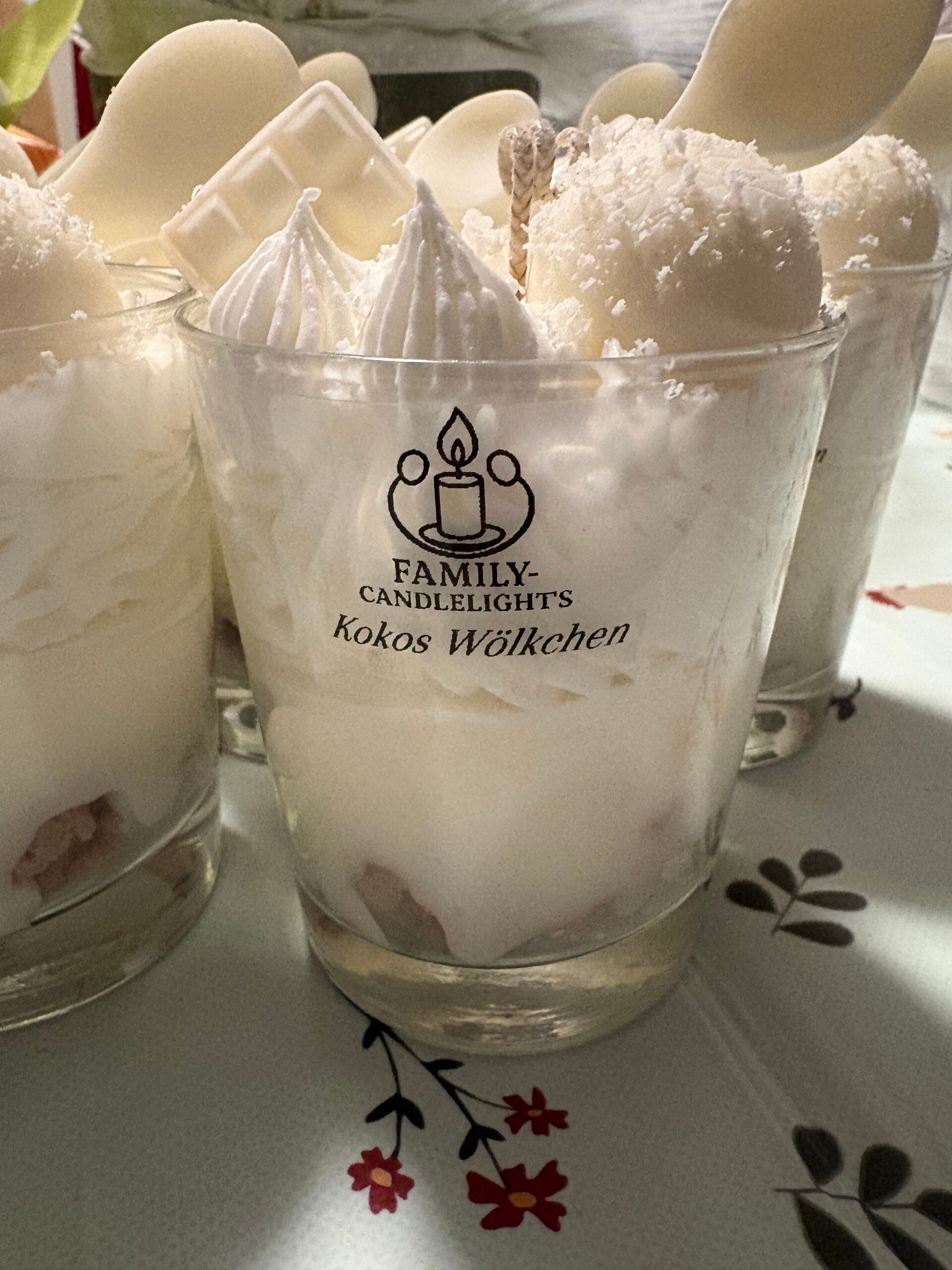 Eine tolle Kerze mit dem Thema Kokos (Raffaelo). Alles selbstgemacht und handgegossen. Der Duft ist Kokos.