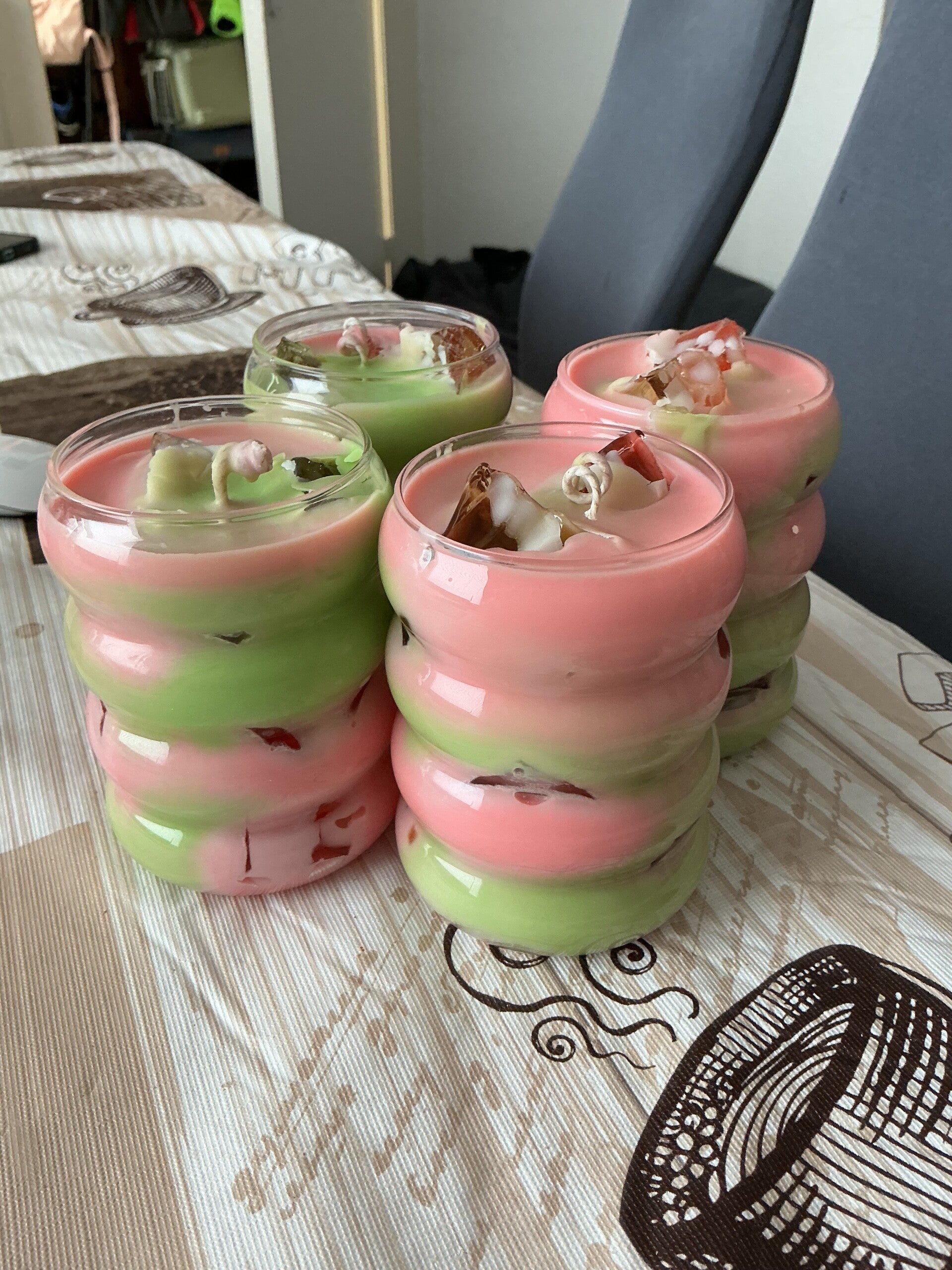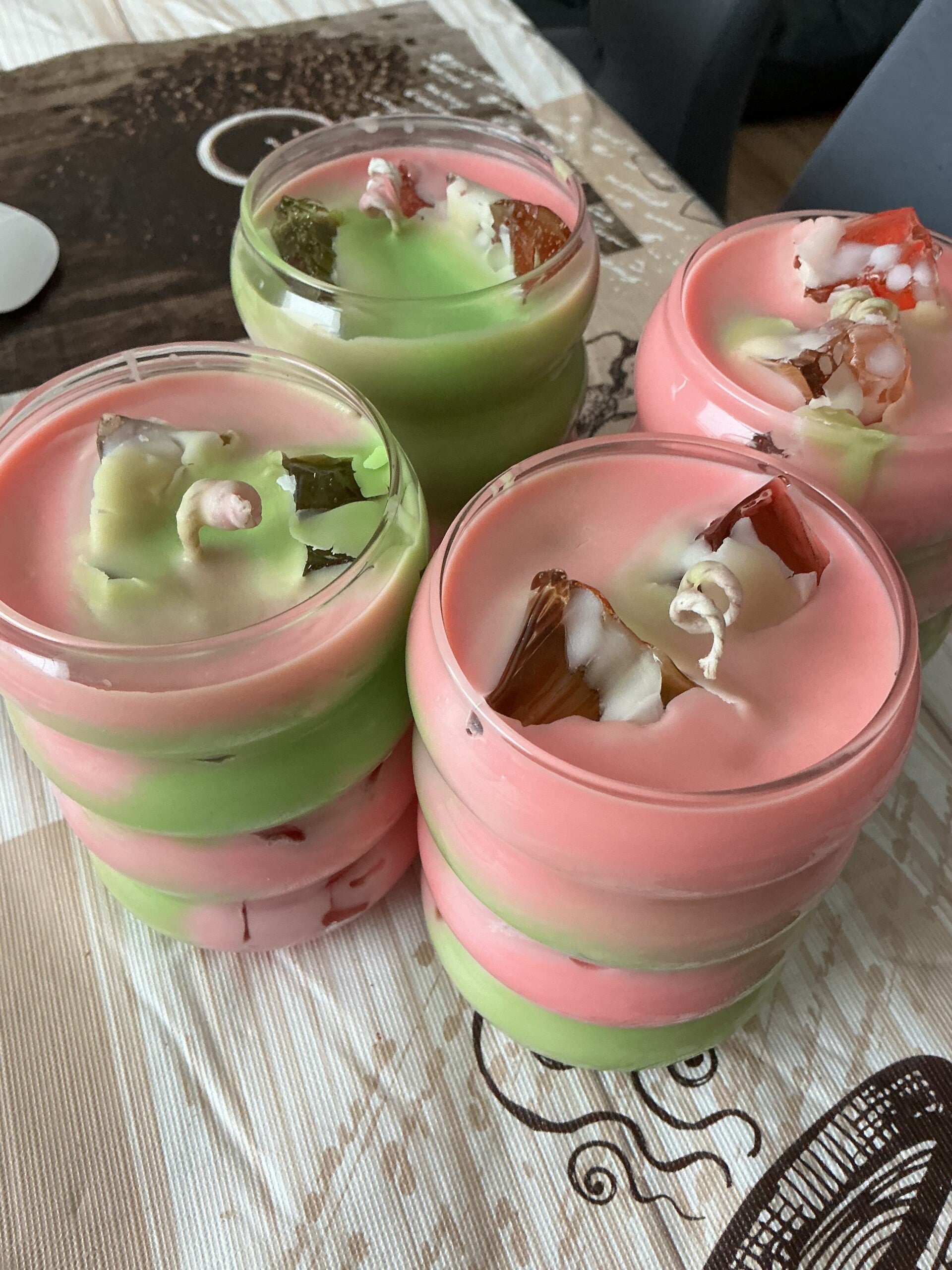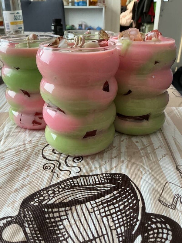 Ein Trendgetränk als Duftkerze. Tolle Mischung aus Erdbeer und Matcha Duft. Auch das Farbenspiel ist super.