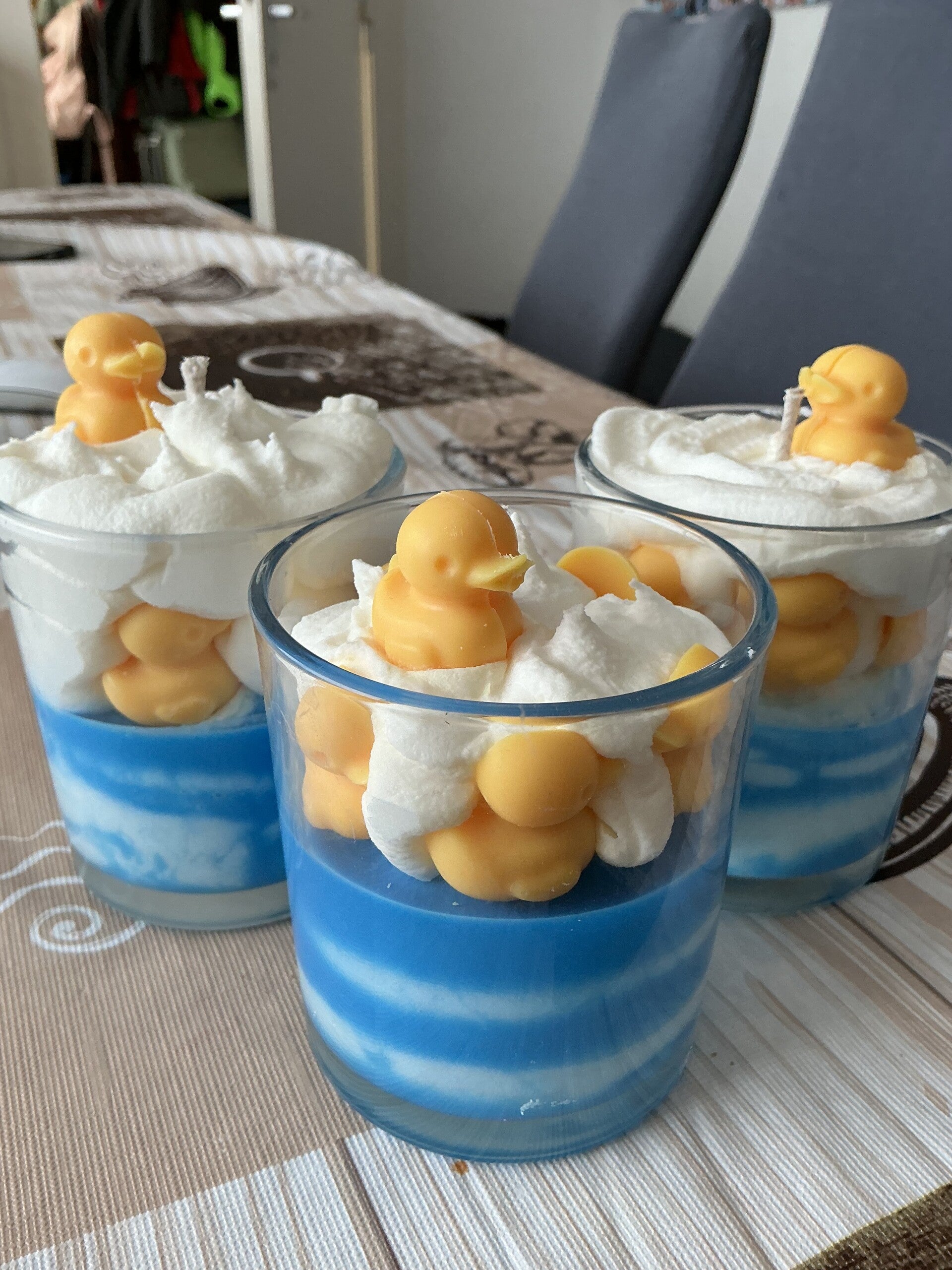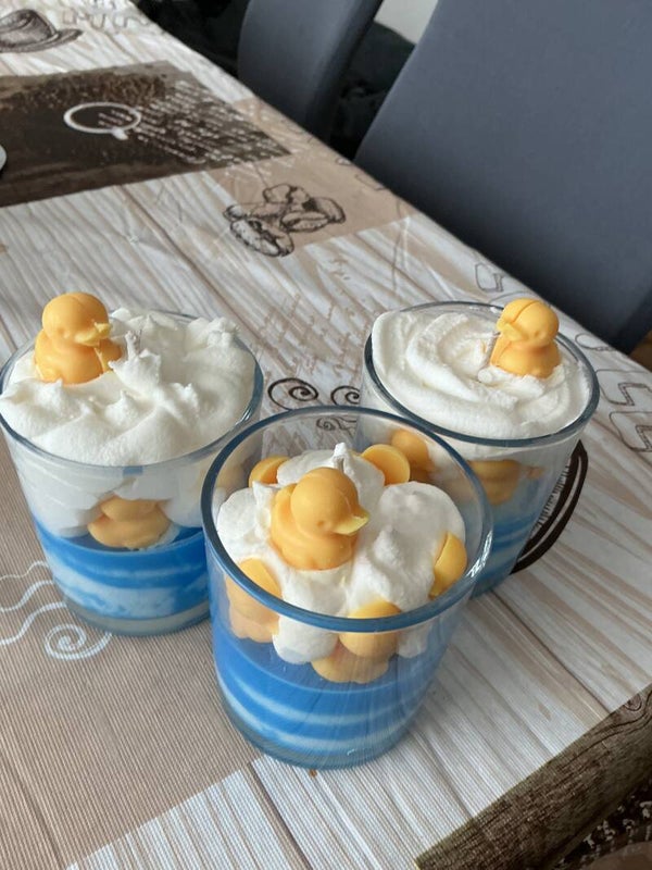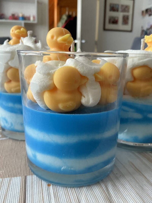 Kleine Quietscheenten und viel Schaum. Dazu ein passender Duft. Das alles bekommen Sie hier mit unserer Badewannenkerze.